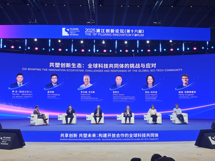 今天中午,2025浦江创新论坛主论坛的最后一个环节,清华大学副校长吴华强,德国国家科学院院士、复旦大学智能医学研究院执行院长罗兰德·艾尔斯,中国科学院上海有机化学研究所生物与化学交叉研究中心副主任、生命过程小分子调控全国重点实验室副主任周界文,爱思唯尔全球期刊总裁劳拉·哈辛克,全球网络峰会首席执行官&创始人帕迪·科斯格雷夫,围绕全球科技共同体的挑战与应对话题,展开了热烈的圆桌讨论。