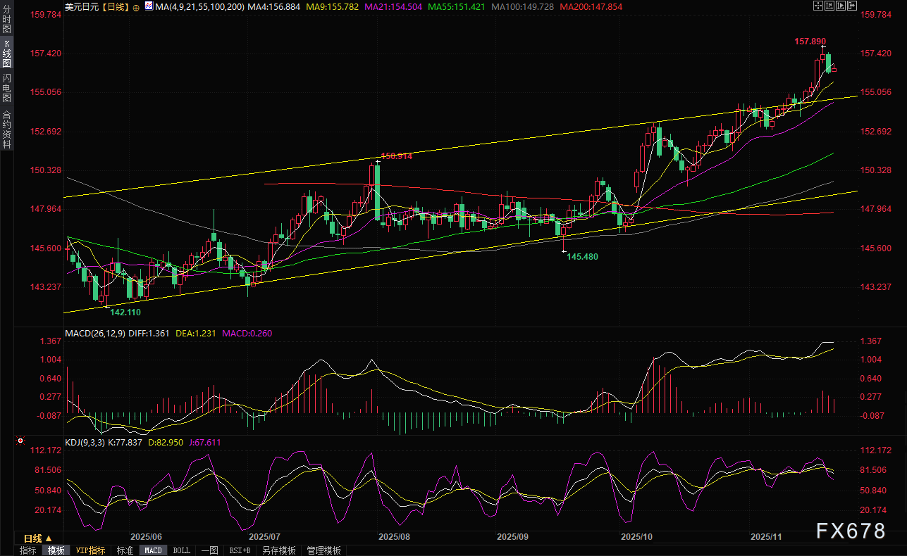 汇通财经APP讯——日元(JPY)在本周初吸引了新的卖盘,部分回吐了上周五的温和反弹涨幅,美元兑日元周一(11月24日)亚洲时段一度上涨0.3%至156.80附近,原因在于市场对日本财政状况恶化的担忧加剧——首相高市早苗(Sanae Takaichi)明确支持刺激政策。此外,市场越来越接受日本央行将推迟加息的预期,叠加整体风险偏好改善实时股票配资平台,均对避险日元构成打压。另一方面,美联储降息预期降温令美元指数徘徊在5月底以来的高位附近,推动美元/日元在亚洲时段上涨。